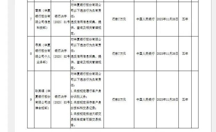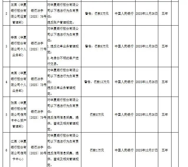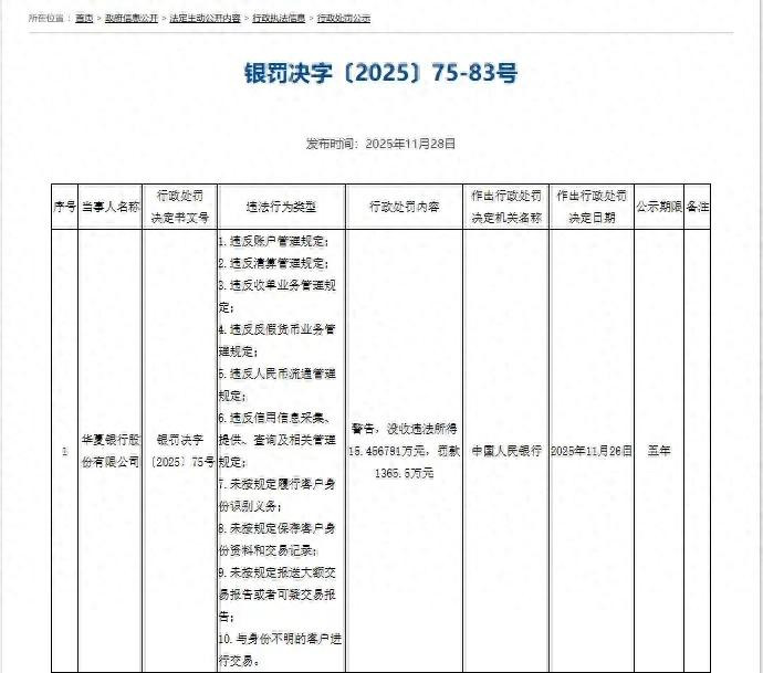 一边是国有大行的金字招牌,一边是账户管理、反洗钱、反假币等10项违规操作扎堆,华夏银行这次的罚单看得人触目惊心——合计没收违法所得1.546791亿元,再罚1365.5万元,9名相关责任人也被分别处以1万至13万元罚款,央行公示期长达五年,这记重拳,敲醒了所有金融机构的合规警钟!